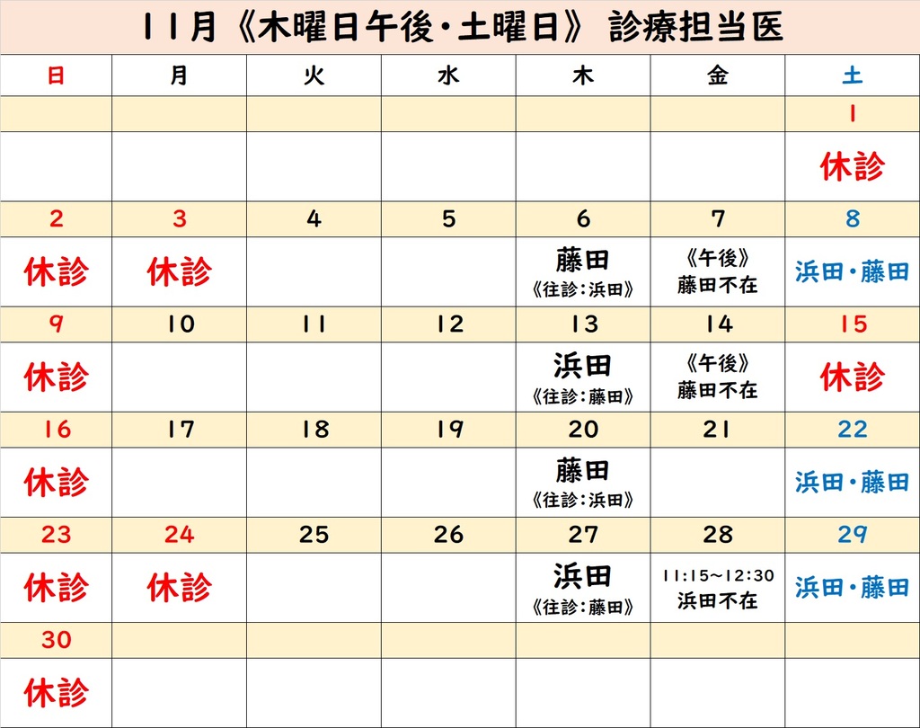 11月7日(金)、14日(金)午後の藤田医師の診療は、ワクチン接種出張のため休診です。